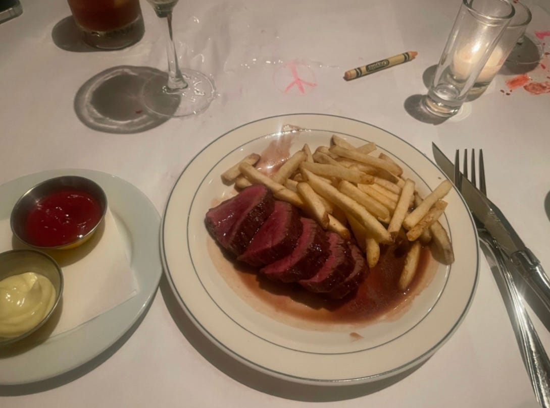 The perfect steak doesn’t exist because I haven’t allowed myself to have it yet. I think I’ve had the perfect organ meat burger, at Hearth on 12th Street. The perfect steak tartare, maybe, at Lucien a few blocks over. The perfect ground beef, extra rare, prepared in my gothic studio apartment. But the perfect steak? The perfect steak requires the perfect company. It asks to be split, then devoured, no laffy taffy, cleanly chewed. Its animal was pasture raised, grass fed and finished, living in better conditions than the patron sitting in front of it. It is a reminder of something else and nothing else, because it is perfect, and perfection is distinct.