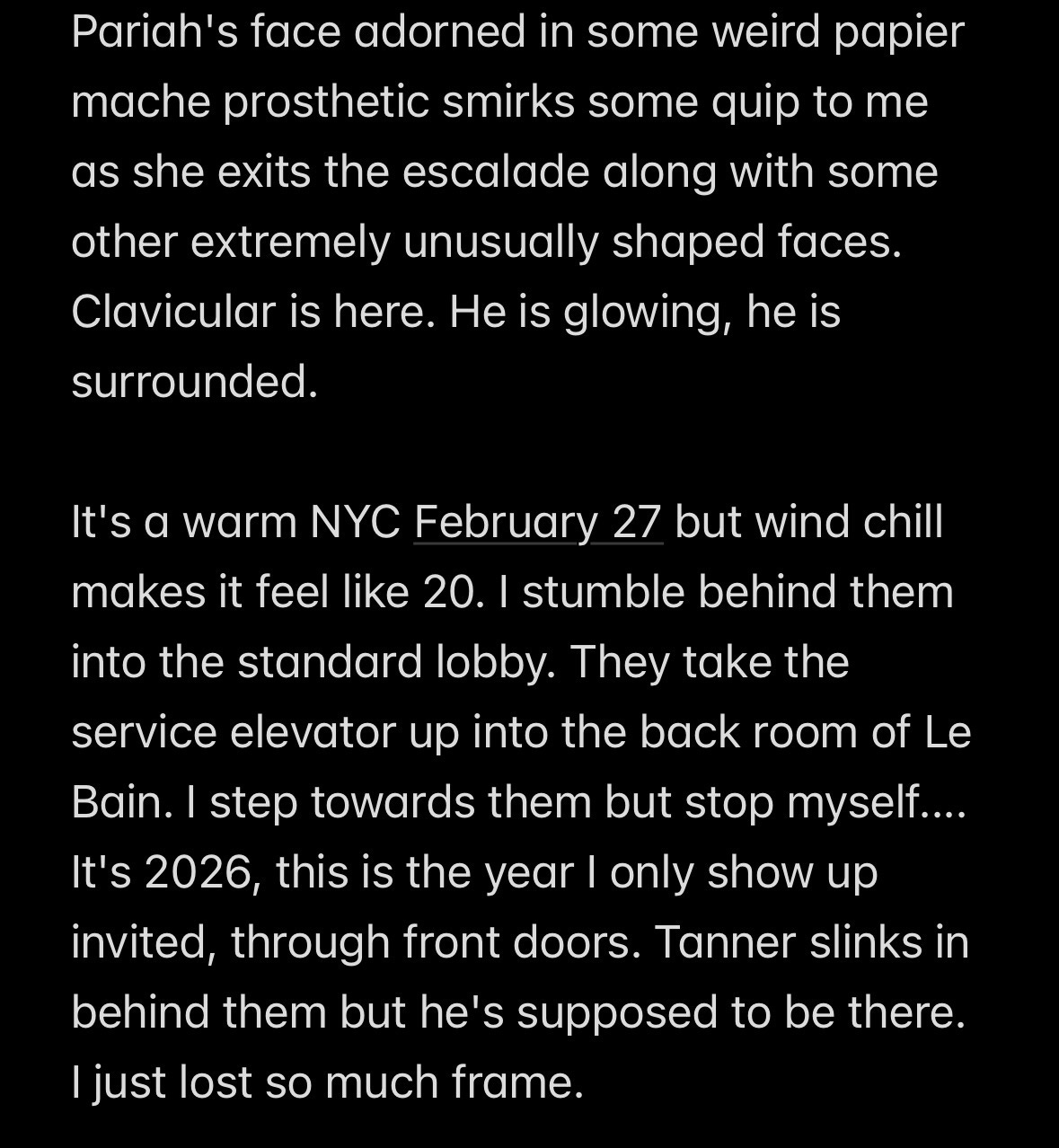 Speaking of walking, Clavicular (read Hot or Not) took the runway at the Elena Velez show Thursday evening. Our New York liaison sent in this report: