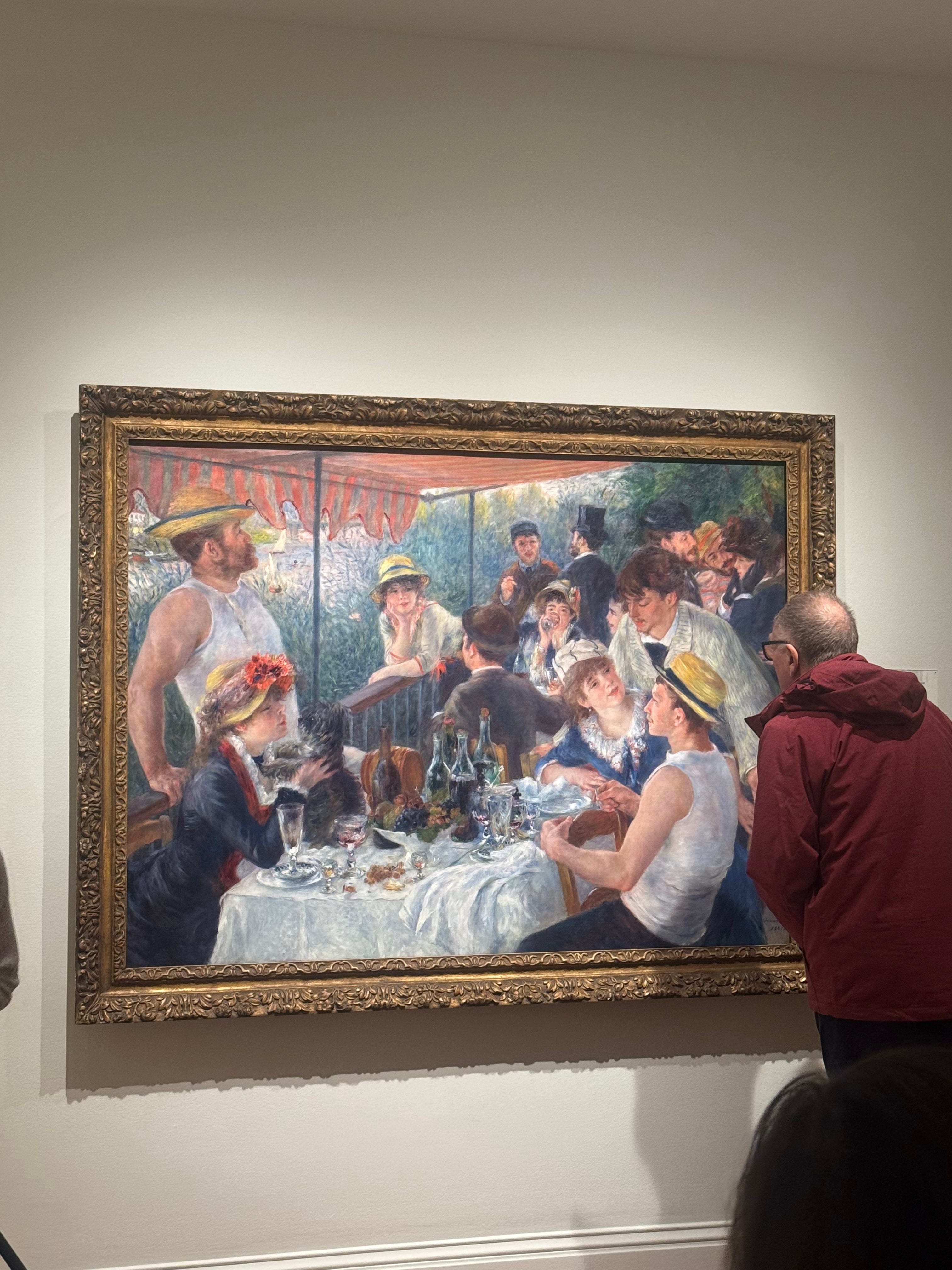 When we go to see the huge, famous Renoir painting, Luncheon of the Boating Party, a woman gives a fifteen minute presentation. She leads us through a 45 second look at the painting, several times longer than most museum-goers will stare at a piece of art. She reminds us to stand evenly across both feet and breathe.