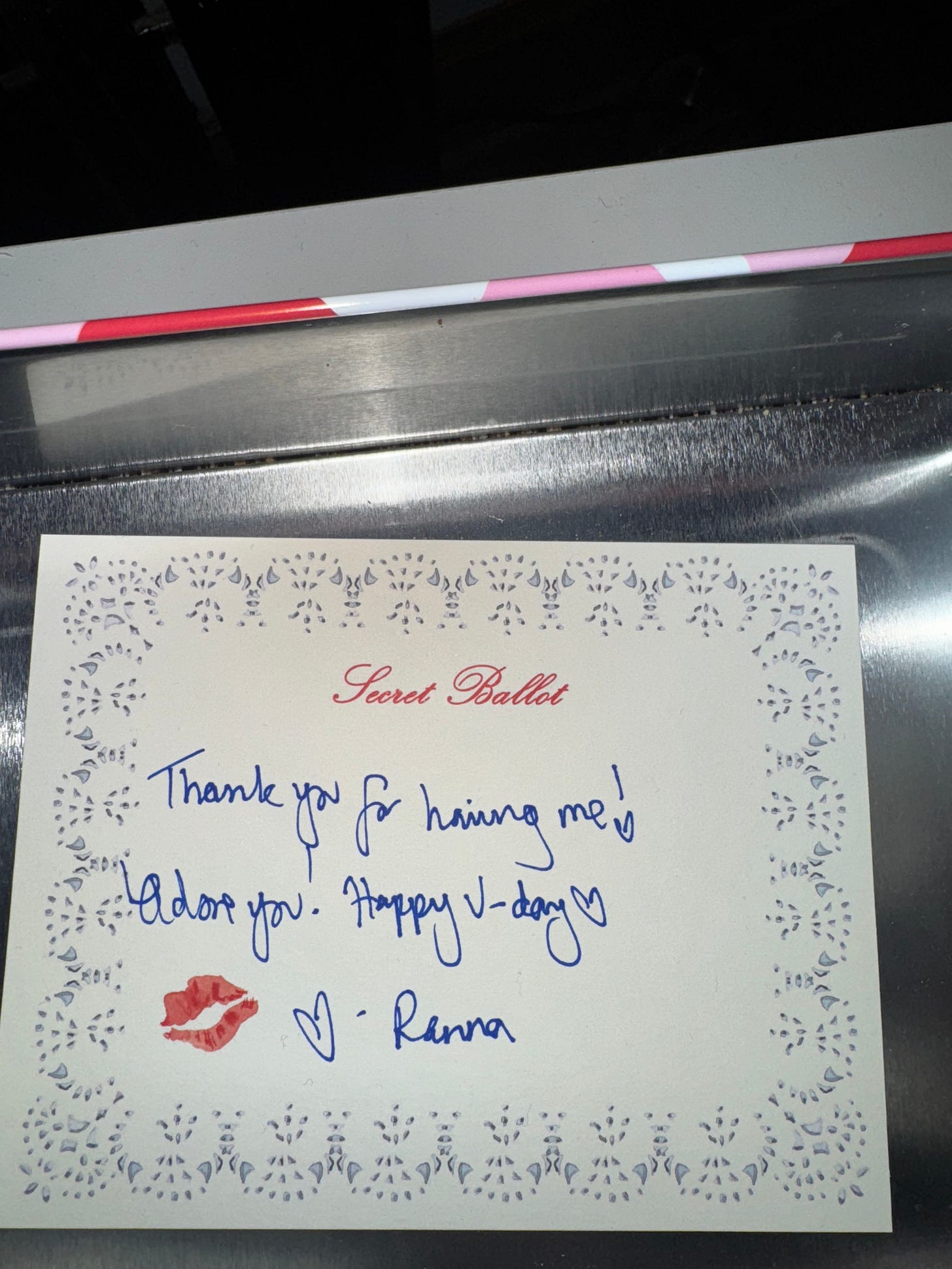 The illustrious Peter Suderman of cocktail Substack fame created our Secret Valentine cocktail menu, including a drink with campari, sweet vermouth, and soda called Cupid’s Bow, a raspberry lemonade punch called Sweet Nothing, a champagne cocktail called Sparkling Wit, and a rum drink with lemon and black tea aka The Matchmaker— sweet drinks are in! They always were, just like love, but some of us needed to be reminded. Thank you, Peter.