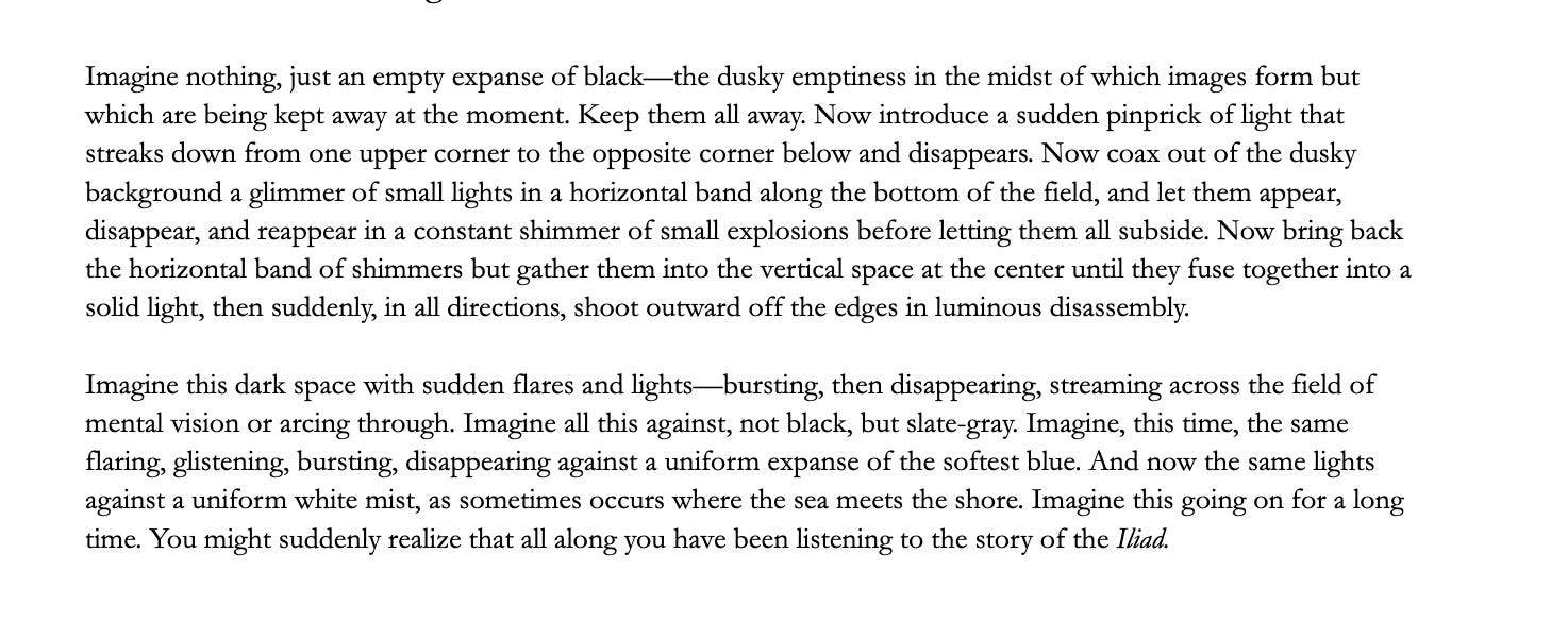 In a later chapter, Scarry explains how even in the much more static world of Madame Bovary, pictures move in the mind of the reader with ease. In order for them to be movable, Flaubert makes them light. These “filmy motions in our minds enable us to create a dense, solid surface beneath,” she writes.