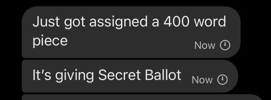 Situation (Chat)Room- We opened up the Substack chat for paid subscribers at the prompting of one tapped-in, 24-year-old Balloter. Our hero! Now, after we post each newsletter, we’ll host a discussion on the subject of that week’s issue. As well as impromptu discussions about anything we think the Secret Ballot readership might want to talk about.