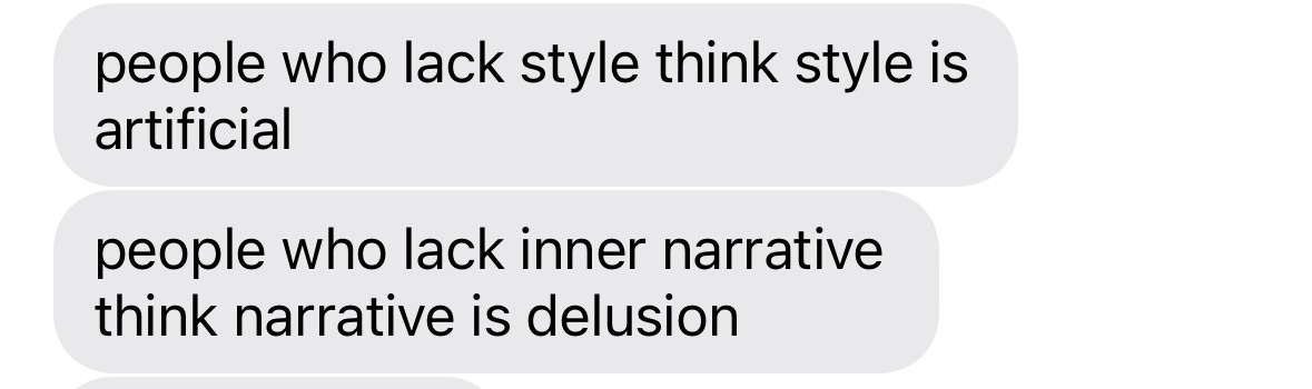 That’s why we react strongly (in a negative way) to lyricism that is botched or an obvious farce. A good example of this would be the shitty excerpt I read of Olivia Nuzzi’s book. A lie could be static but not harmonious, or have too much sameness, where you’re flooded with just that one thing.